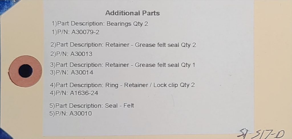 WHEEL ASSY 6.00-6 MCCAULEY WITH BEARINGS (2ea) GREASE FELT SEAL RETAINER (2ea) GREASE FELT RETAINER (1ea) LOCK CLIP (2ea) FELT SEAL (1ea)